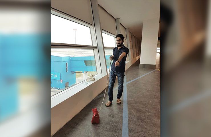While Kontar missed flights to Honolulu, Australia, the Maldives, and Myanmar his sense of humor about his situation came to the forefront. He took to social media, posting pictures of him tending to his garden – a single potted plant- and walking his pet, a stuffed animal on a leash, around the airport terminal.
