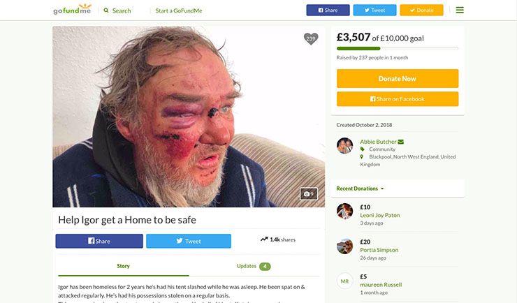 According to Butcher: “This poor guy has been beaten to a pulp by youths and had all of his stuff stolen and his belongings thrown into the sea. It is barbaric what’s happened.” Butcher also stated the obvious when he told reporters, “Igor deserves to live in safety, and not be abused like this.” Luckily, there are caring people in the world who immediately banded together to help this man.